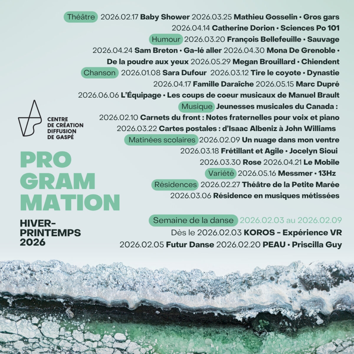 Dévoilement de la programmation hiver-printemps 2026 présentée au Centre de Création Diffusion de Gaspé. Chanson, musique, humour, théâtre et danse.